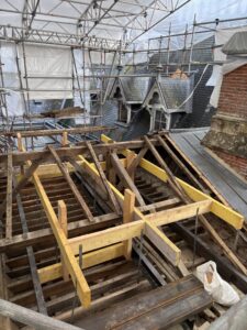 Les études récentes ont mis en évidence des désordres très importants : infiltrations d’eau, charpente attaquée par la mérule, fragilisation de certains éléments porteurs et altération de décors. Les travaux engagés en 2026 ont pour objectif de stopper une partie ces dégradations et de stabiliser durablement l’édifice.